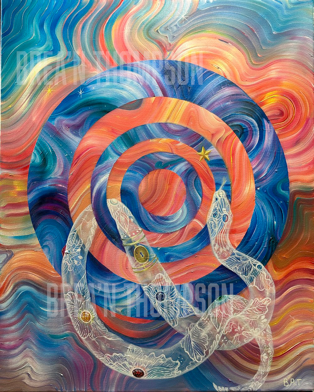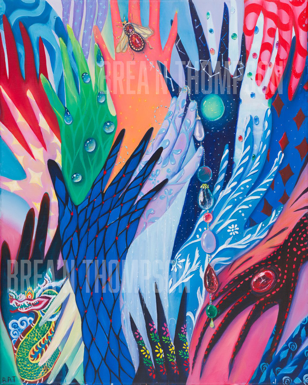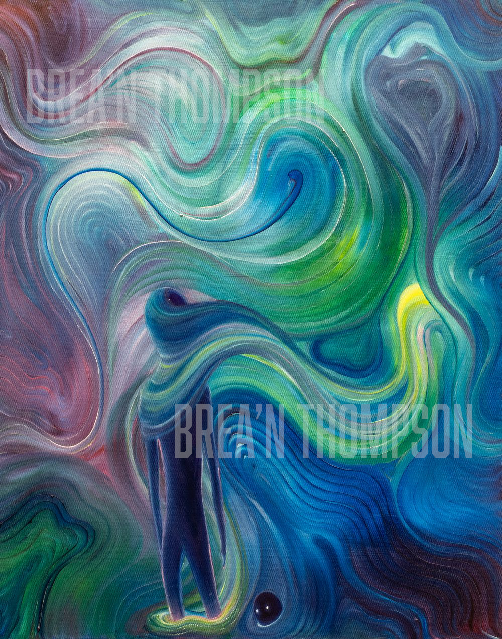 Brea’n Thompson was born in Houston, Texas in 1989. While working on her B.A. in Earth and Environmental Science/Geology from University of Las Vegas Nevada, she became inspired to pursue a career in the arts using her experience in Geology to influence her work. As a synesthete, she utilizes her unique ability to see colors in the sounds she hears. Many of her paintings incorporate vibrant colors and lively textures to depict the movement of music. Implementing the effects of textured brushwork, Brea’n seeks to convey the swirl of colors embedded deep in her mind’s eye. Layered with mystery, a playful flirtation with the occult, she uses vibrant colors and interesting textures to create portraits with intimate views into other dimensions that evoke new perceptions of melody and rhythm. Through her work, Brea’n strives to unmask what it means to human and what happens when you no longer are.